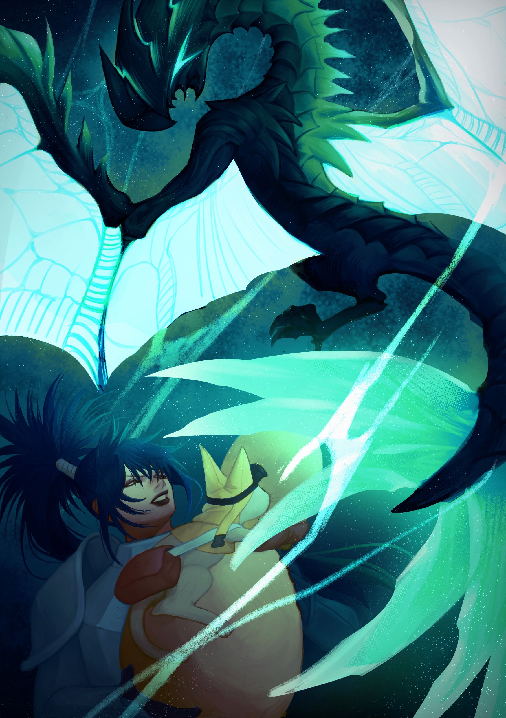Illustration featuring Astalos for the "Tales from the Gathering Hub," a Monster Hunter WIlds fanzine organized by .dotzines. Below is the sketch, render, type design, and final.