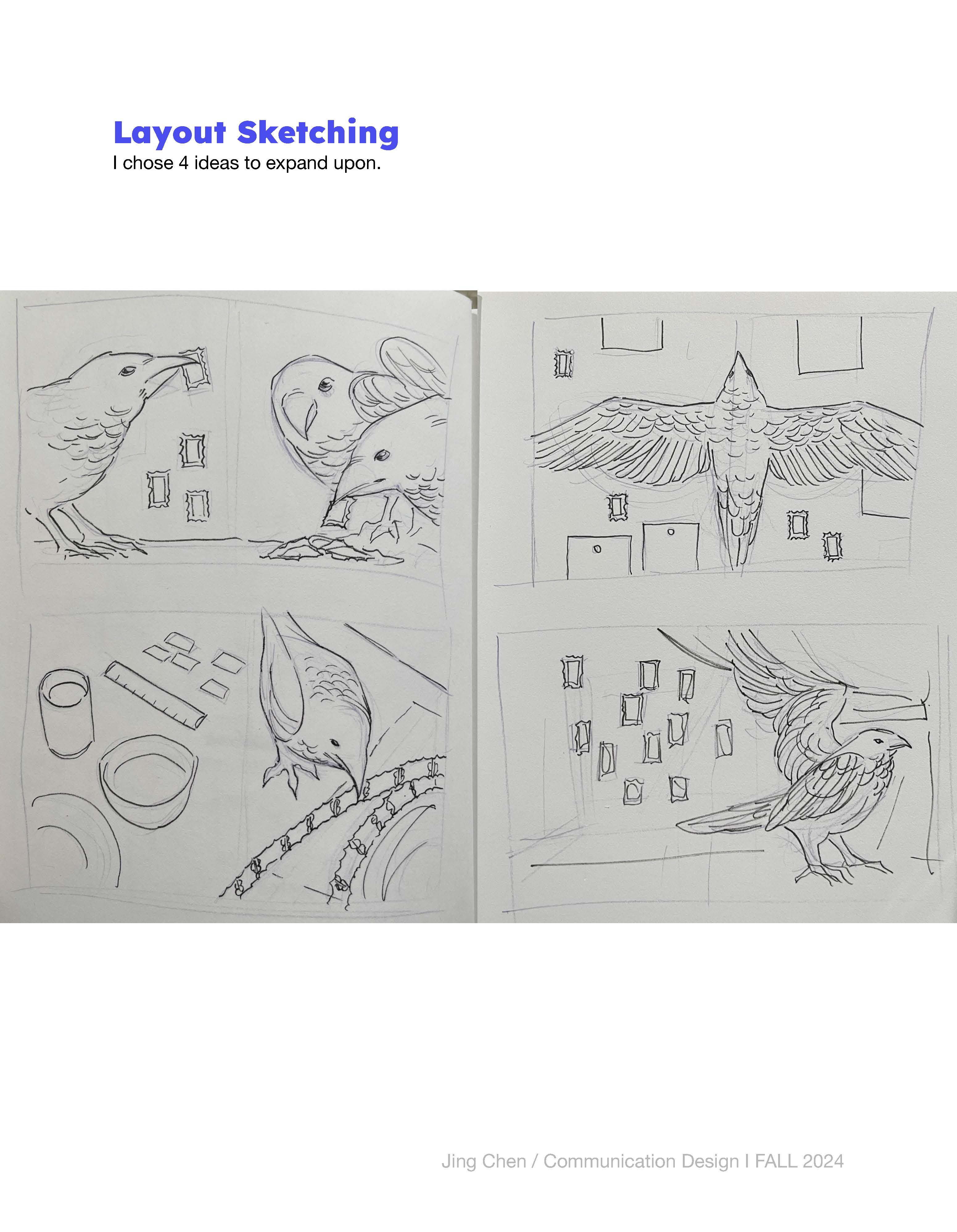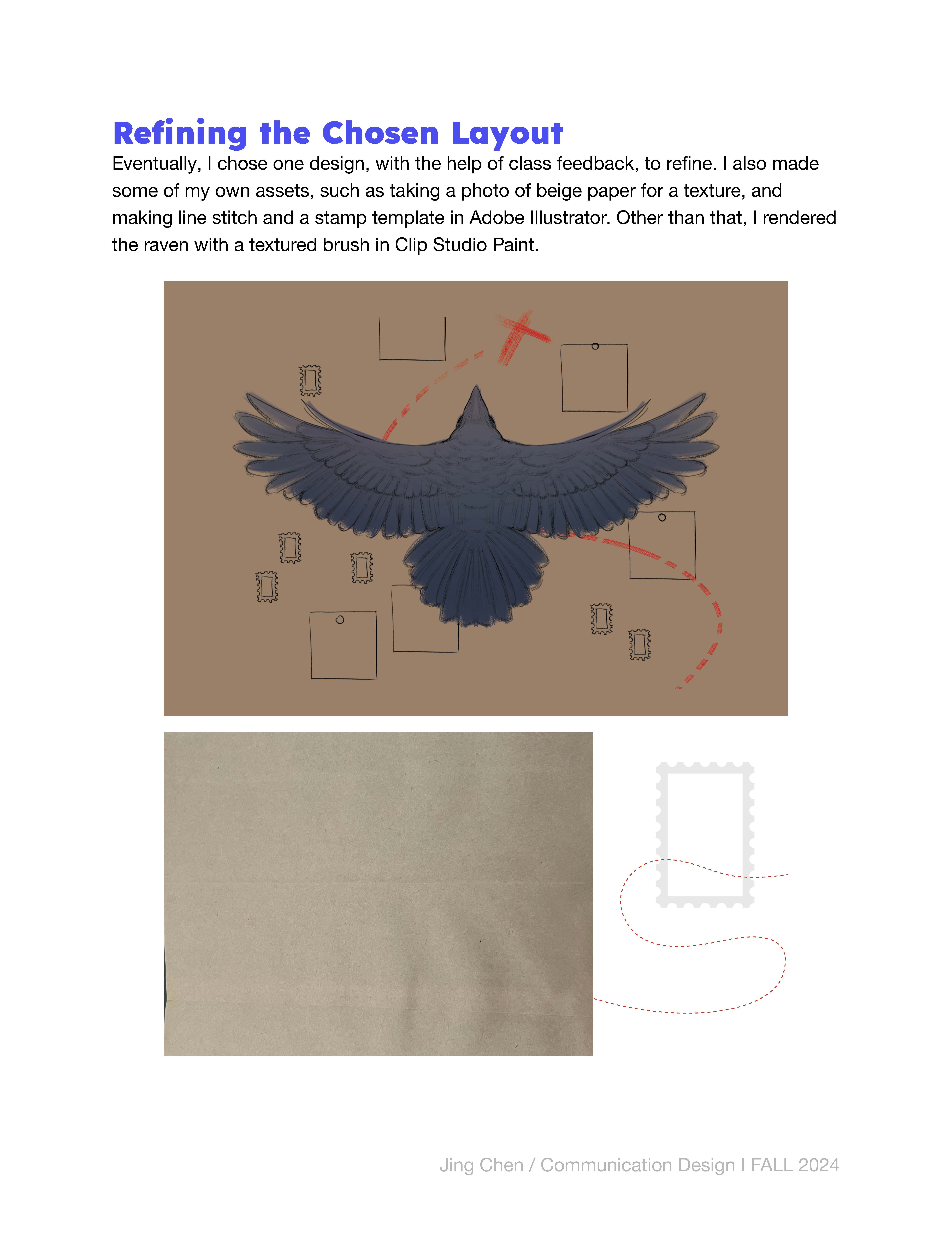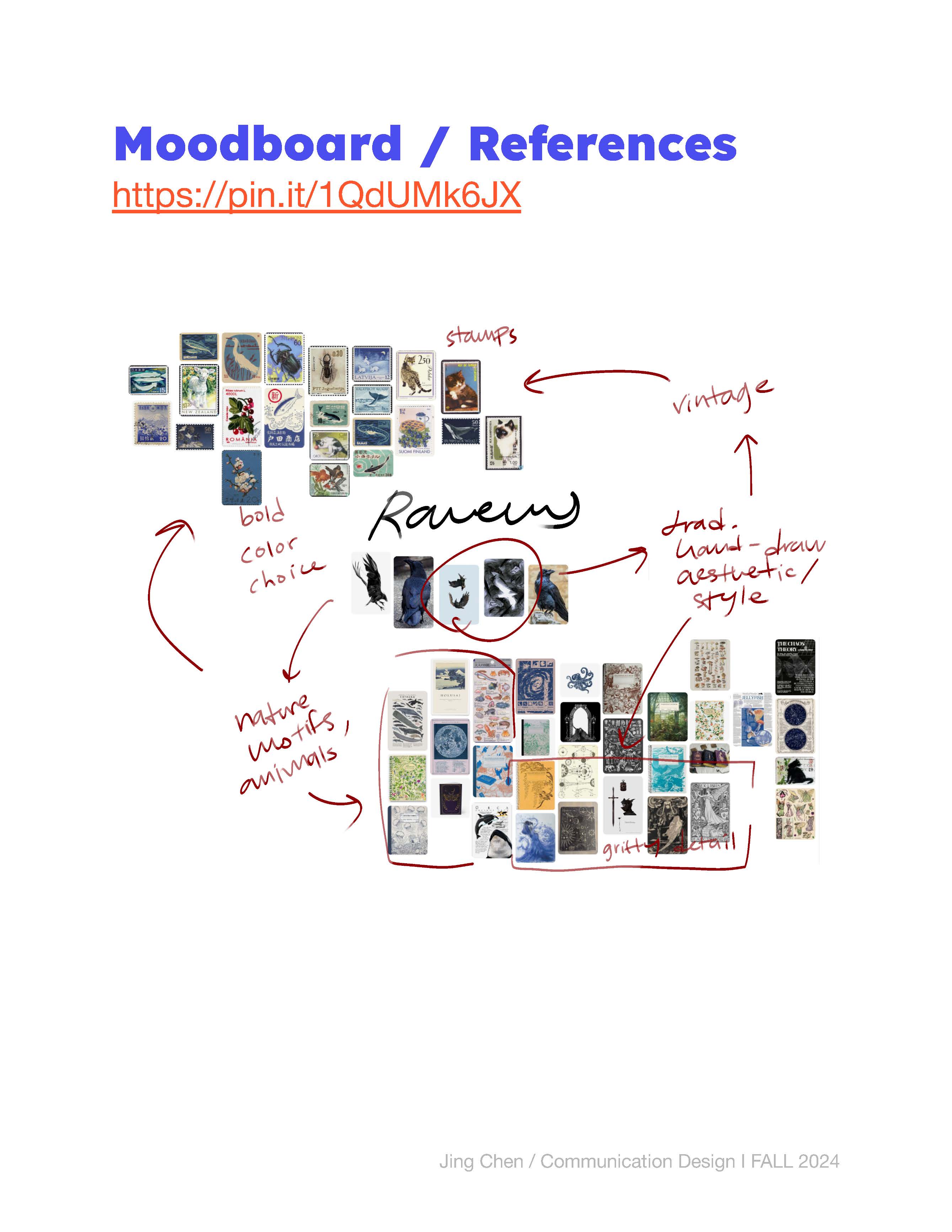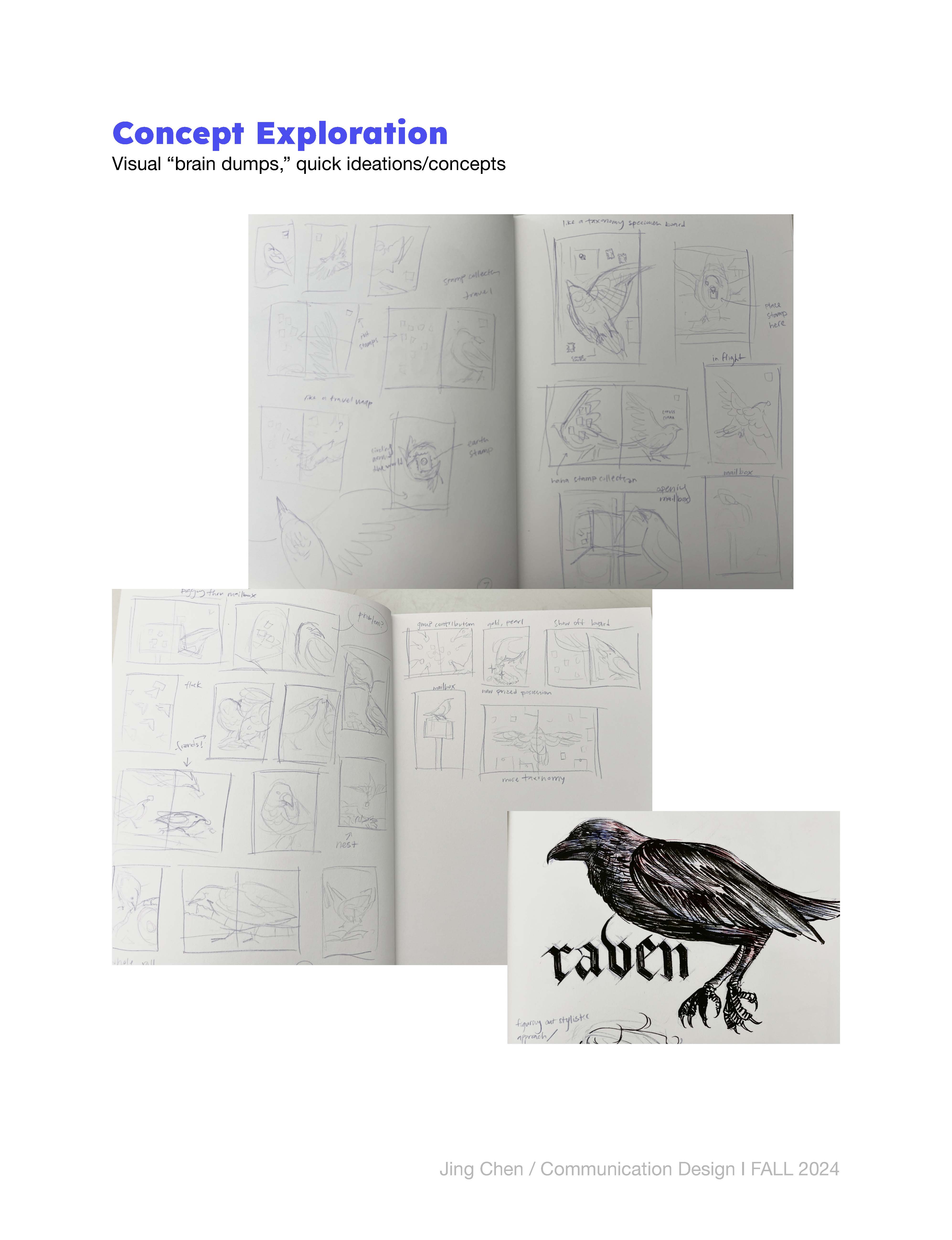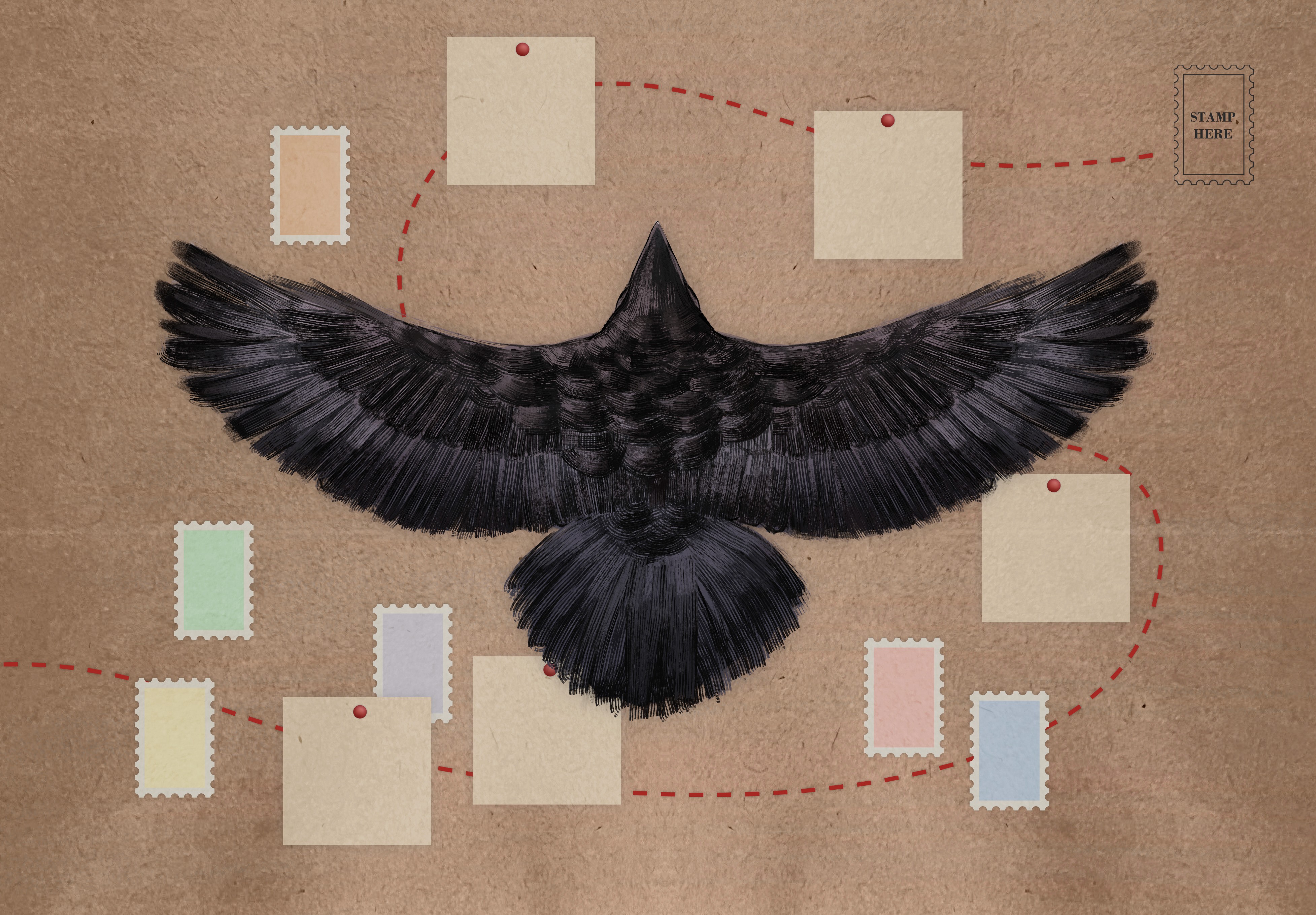 3rd place winner; notebook cover illustration for Pigna's cover design contest. Concept was to involve stamp collection and travel, with the knack of corvids being known to collect trinkets. Final design, mockup, and process are shown below.
